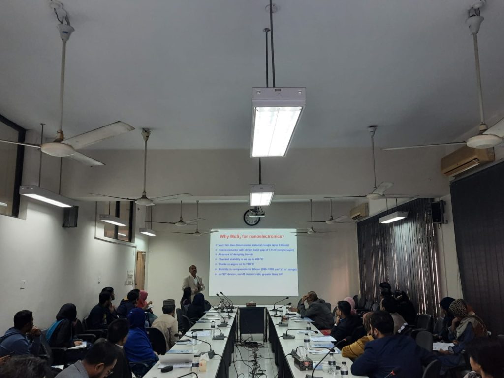 The chief guest Prof. Dr. Md. Selim Reza, Dean, Faculty of Pharmacy, University of Dhaka, delivered an insightful presentation on the transition from conventional drug delivery systems to advanced nano-drug delivery platforms, highlighting their impact on precision medicine and therapeutic efficiency. Prof. Dr. Jal Singh, Department of Pure and Applied Physics, Guru Ghasidas Vishwavidyalaya, India, spoke about recent progress in two-dimensional transition metal dichalcogenides and their promising applications in nanoelectronics and thermoelectric devices. The program was chaired by Prof. Dr. Md. Abu Bin Hasan Susan, Director, Dhaka University Nanotechnology Centre and Professor, Department of Chemistry, University of Dhaka. In his welcome address, Prof. Susan highlighted the growing significance of nanotechnology as a multidisciplinary platform that connects chemistry, physics, pharmacy, engineering, and materials science. He encouraged students and researchers to actively engage in innovative research that addresses real-world challenges through nanotechnology.